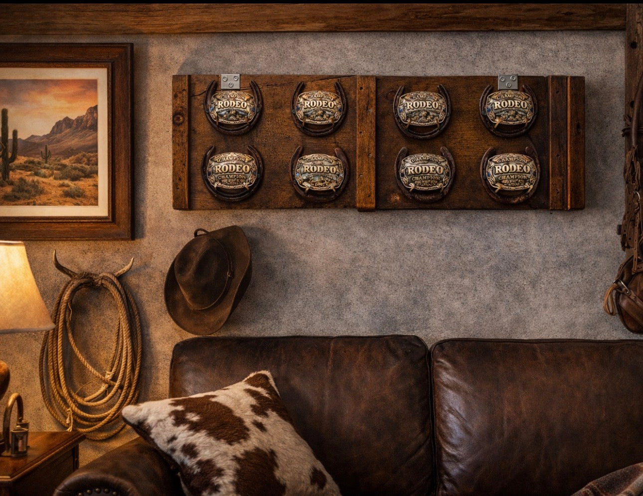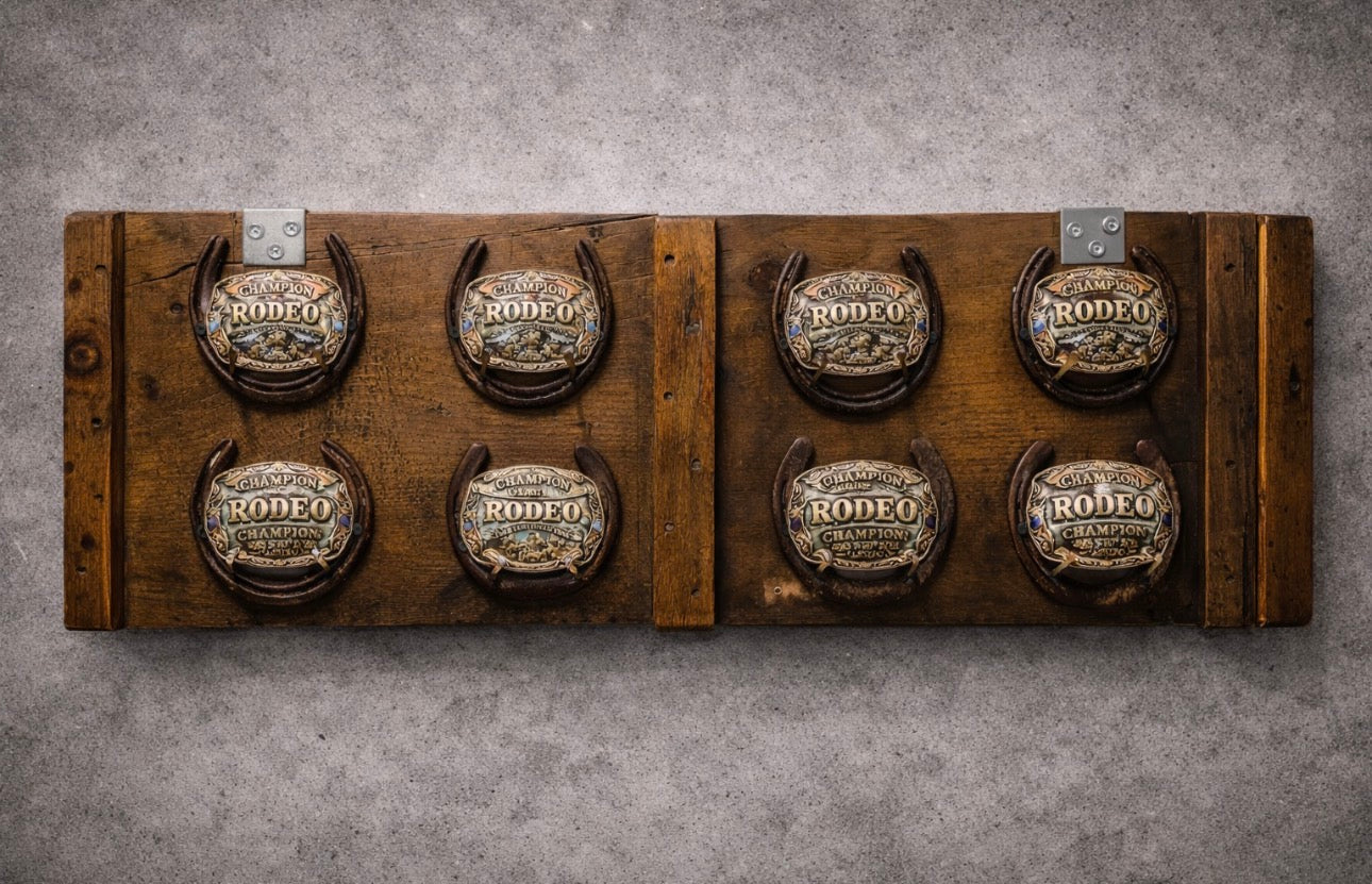 The Cavalry originates from a Howitzer Crate used in the Vietnam War. The Rest is meant to display belt buckles, ribbons and awards. The hand-rubbed finish adds to the weather worn wood and has been retrofitted with old horse shoes. This item can be customized to fit any special item you want to display.