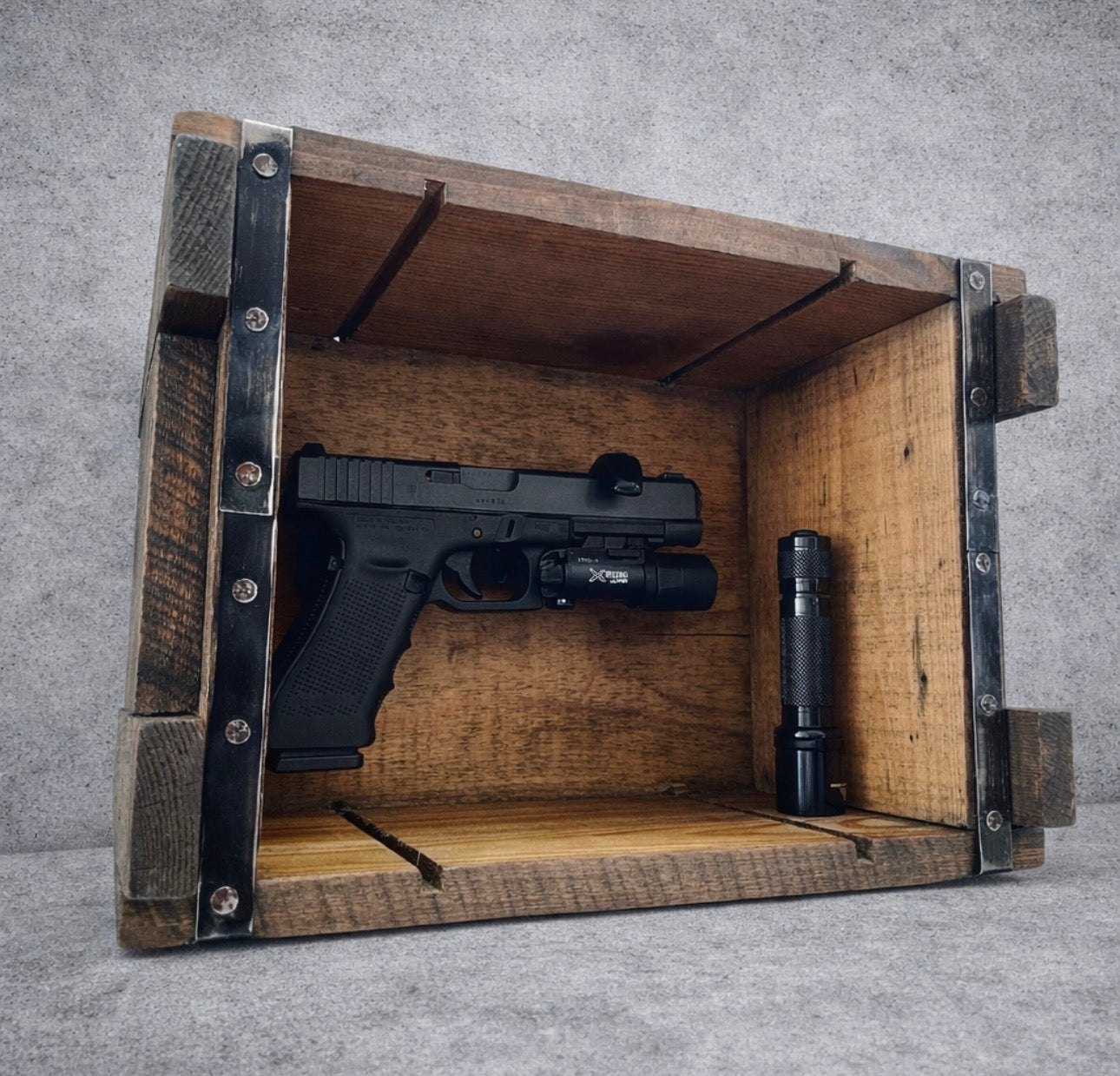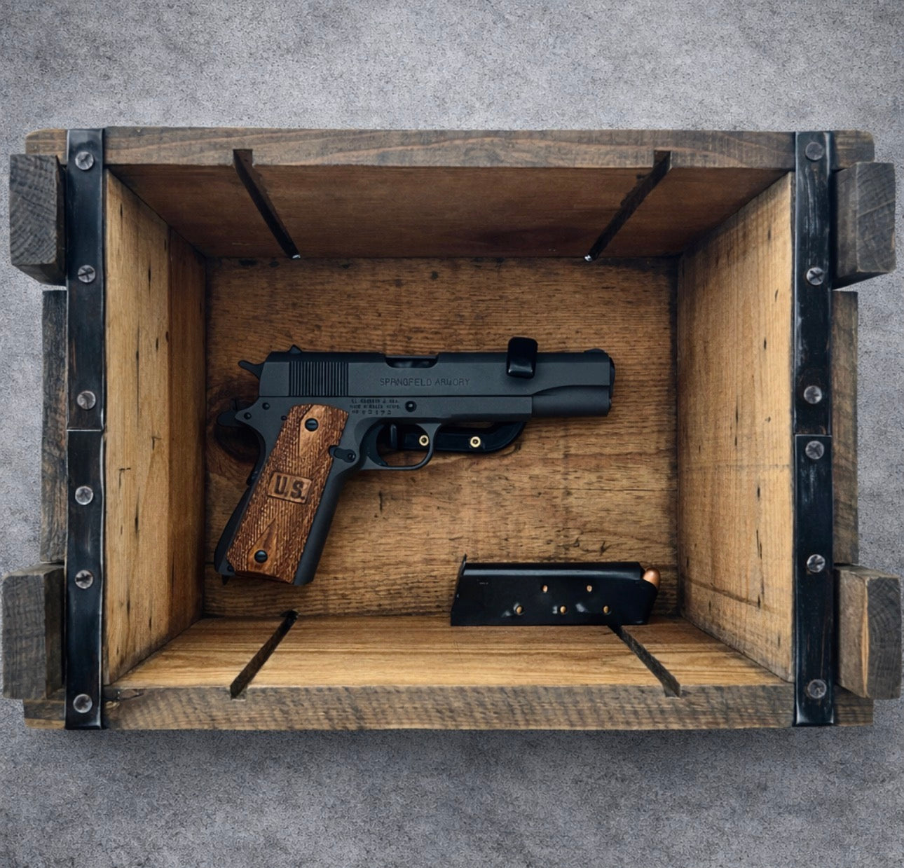 These crates were first put to use during WWII and held 42 pounds of .50 caliber ammunition and retrofitted with a handgun mount to display in a shadow box.