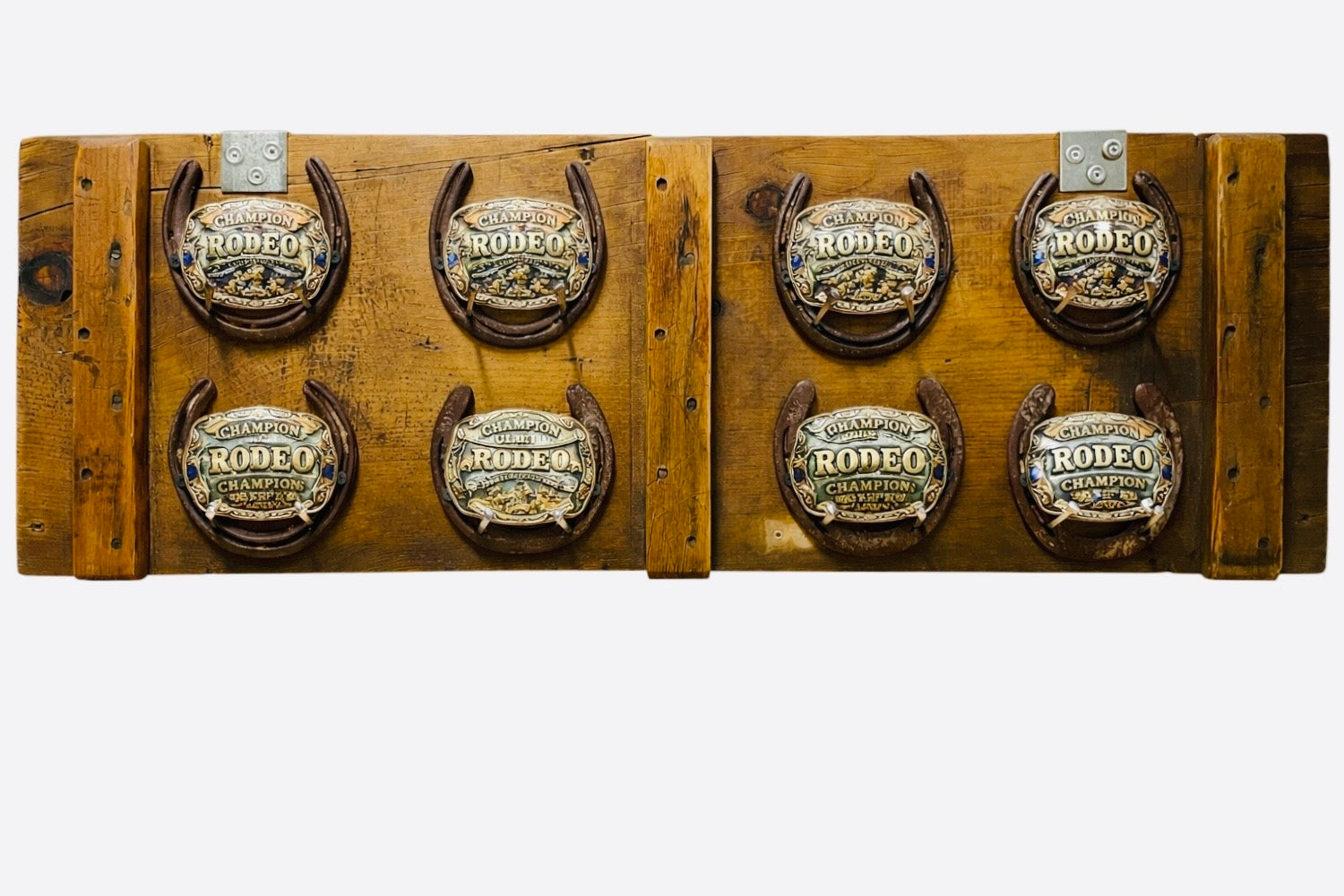 The Cavalry originates from a Howitzer Crate used in the Vietnam War. The Rest is meant to display belt buckles, ribbons and awards. The hand-rubbed finish adds to the weather worn wood and has been retrofitted with old horse shoes. This item can be customized to fit any special item you want to display.