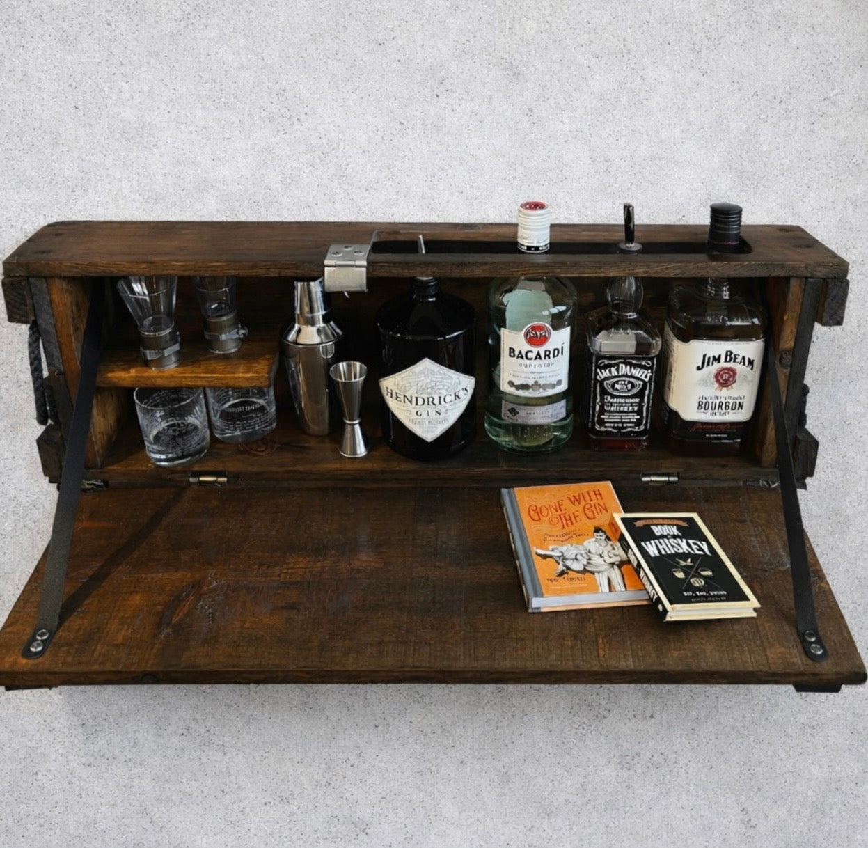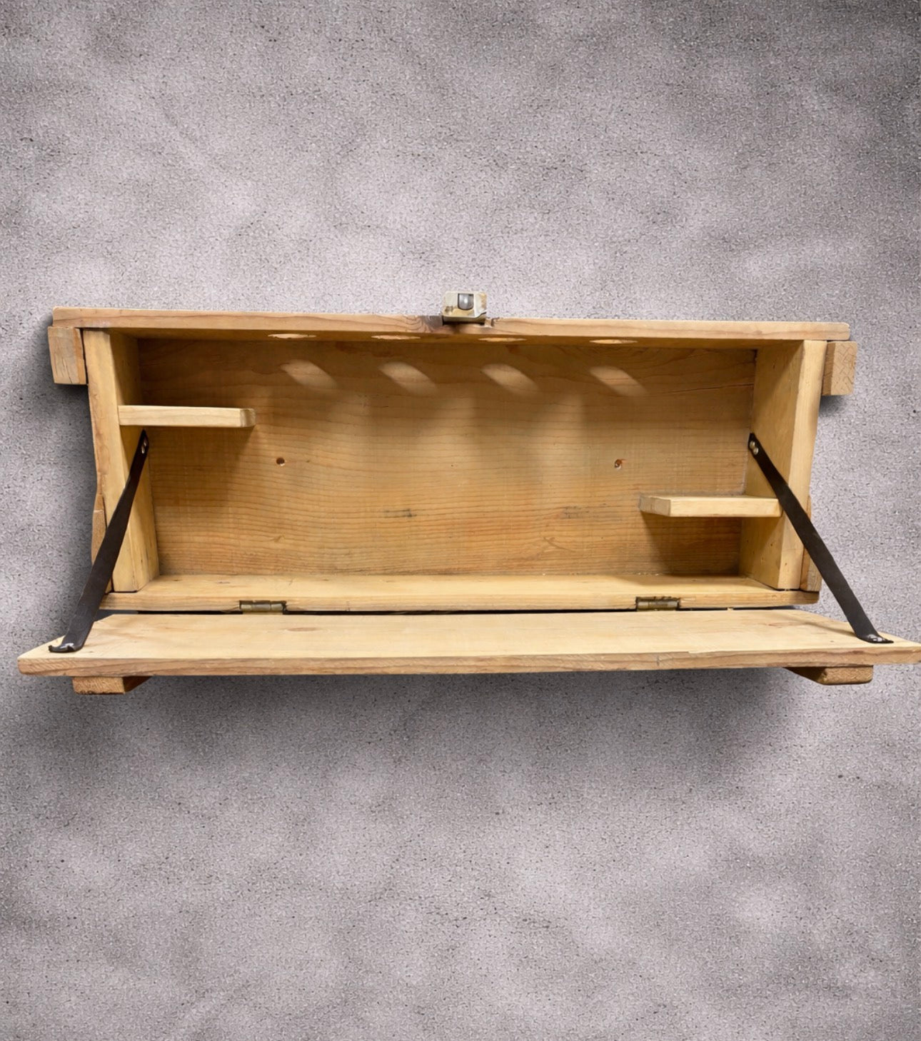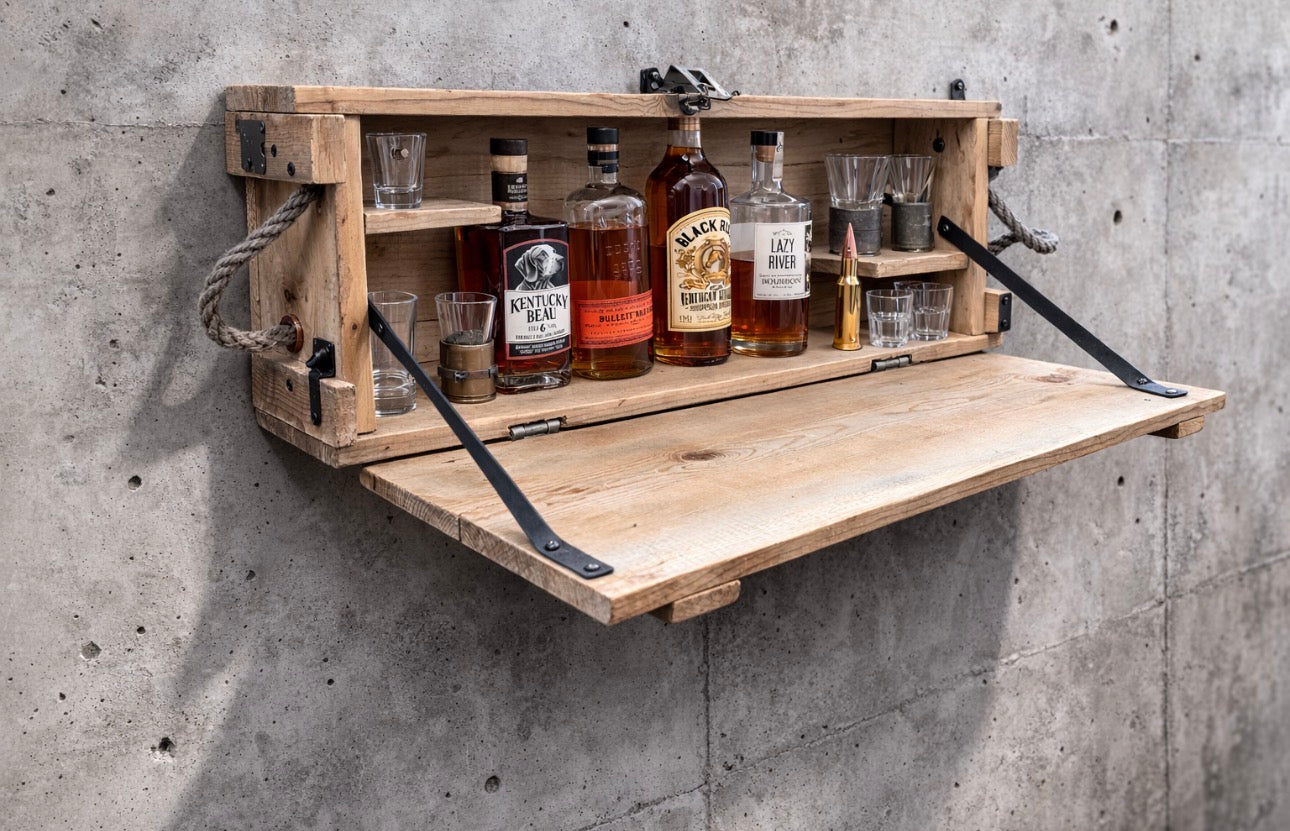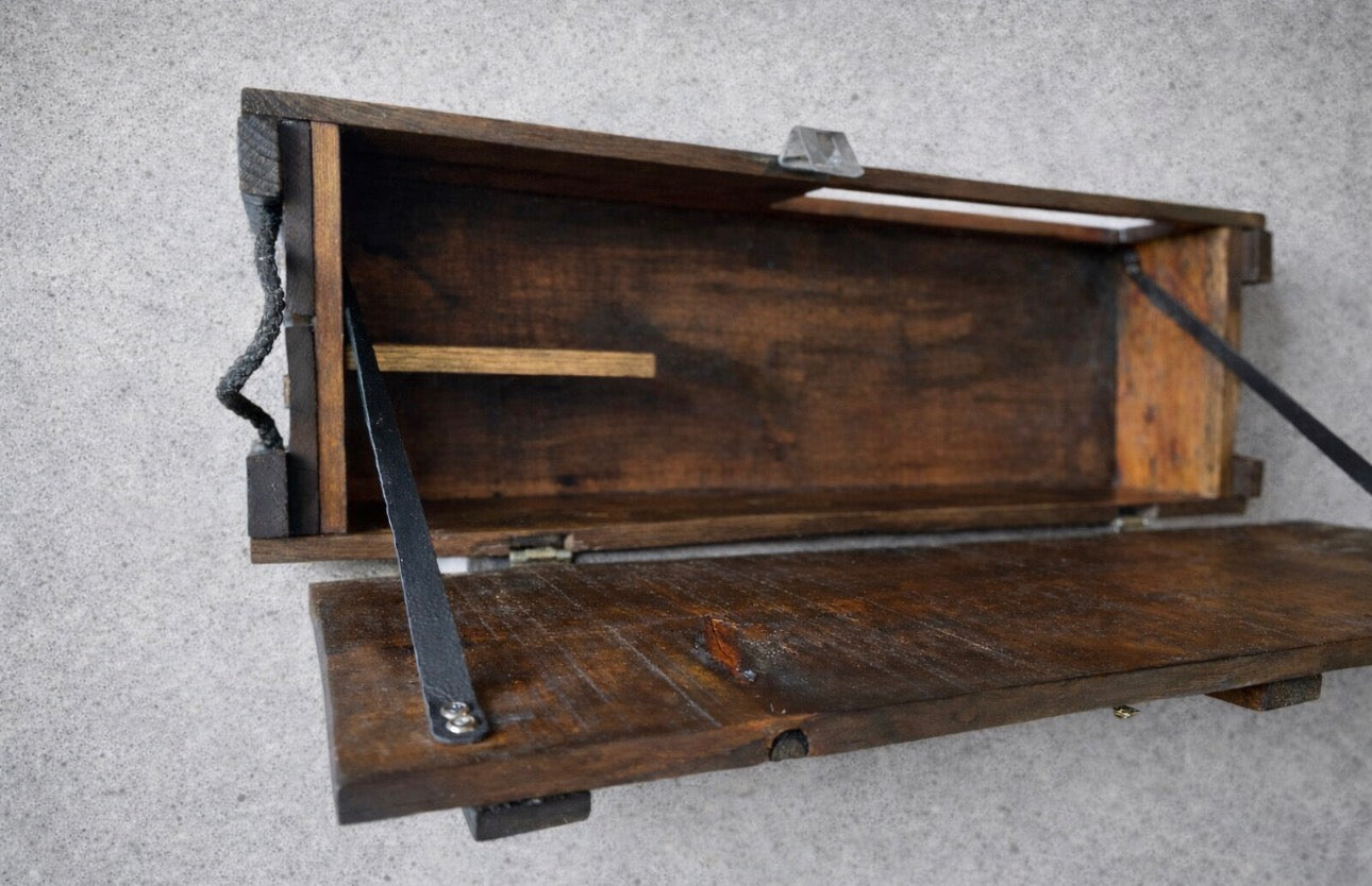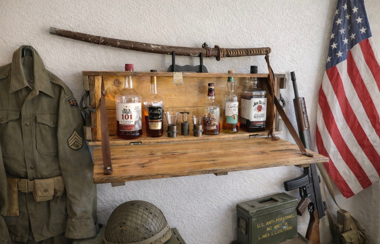 Some of these Howitzer crates have been designed as a Murphy Bar. The hinged door folds down to offer an additional serving surface. The door has been reinforced with leather straps to add to the already timeless look. This crate can hold several 750ml-1.5 liter bottles, along with a few glasses and more.
