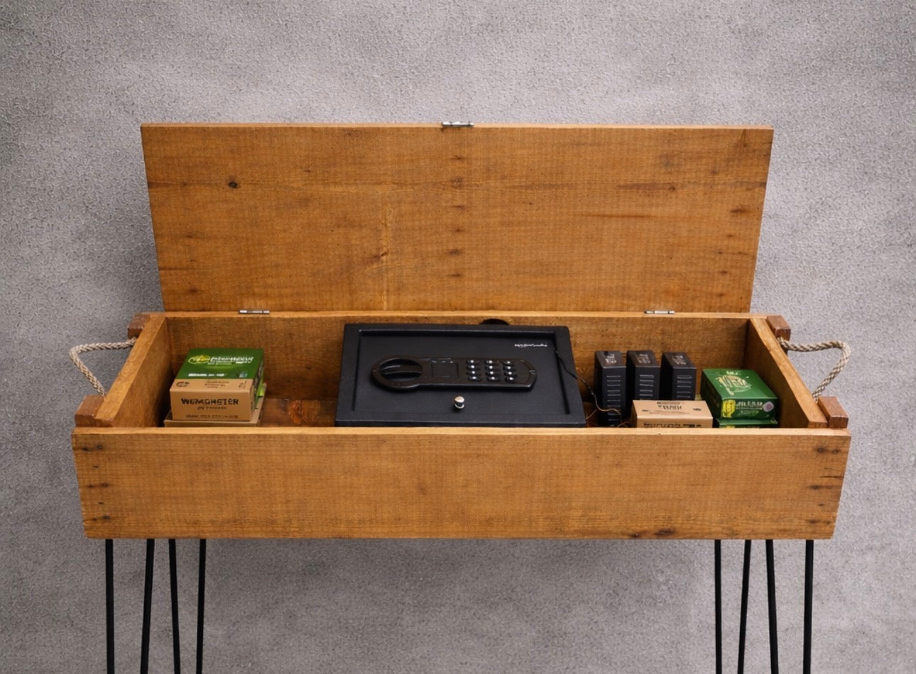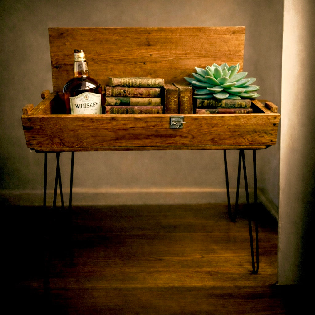 This timeless piece is named after an American military operation during the Vietnam War, called Hastings. This Console Table makes a great addition to any home. This piece can be utilized as an end table, night stand or coffee table. Furniture legs can also be removed for placement on a flat surface. Displaying the crate open allows the wine, books and/or collectables to be exhibited. All of the latches are in working order and can be additionally fortified.