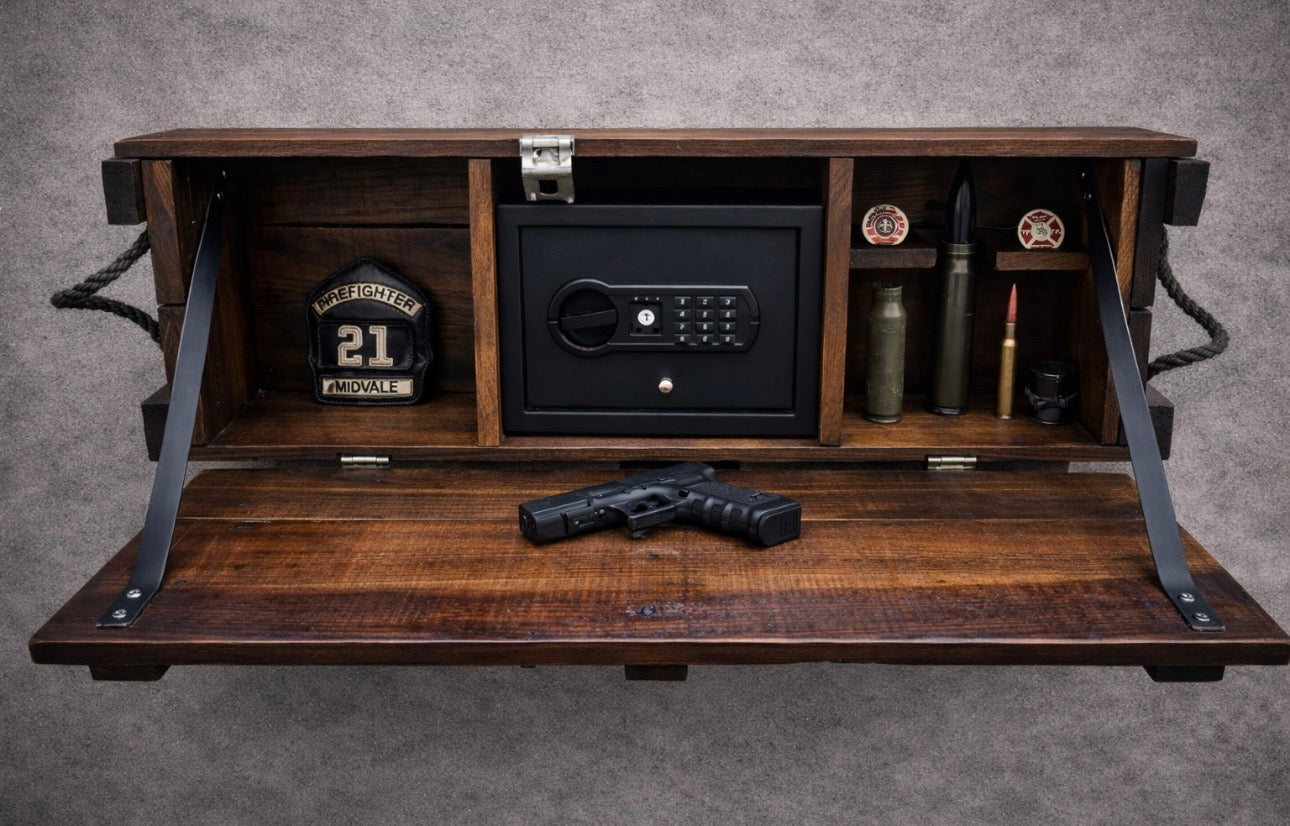 This Original Vietnam Howitzer crate has been designed to house a safe. The hinged door folds down to offer an additional work surface. The door has been reinforced with leather straps to add to the already timeless look. There are shelves to display 2-4 challenge coins and room for other tactical gear. Safe included