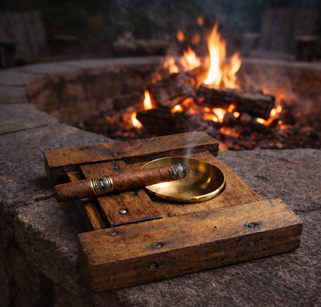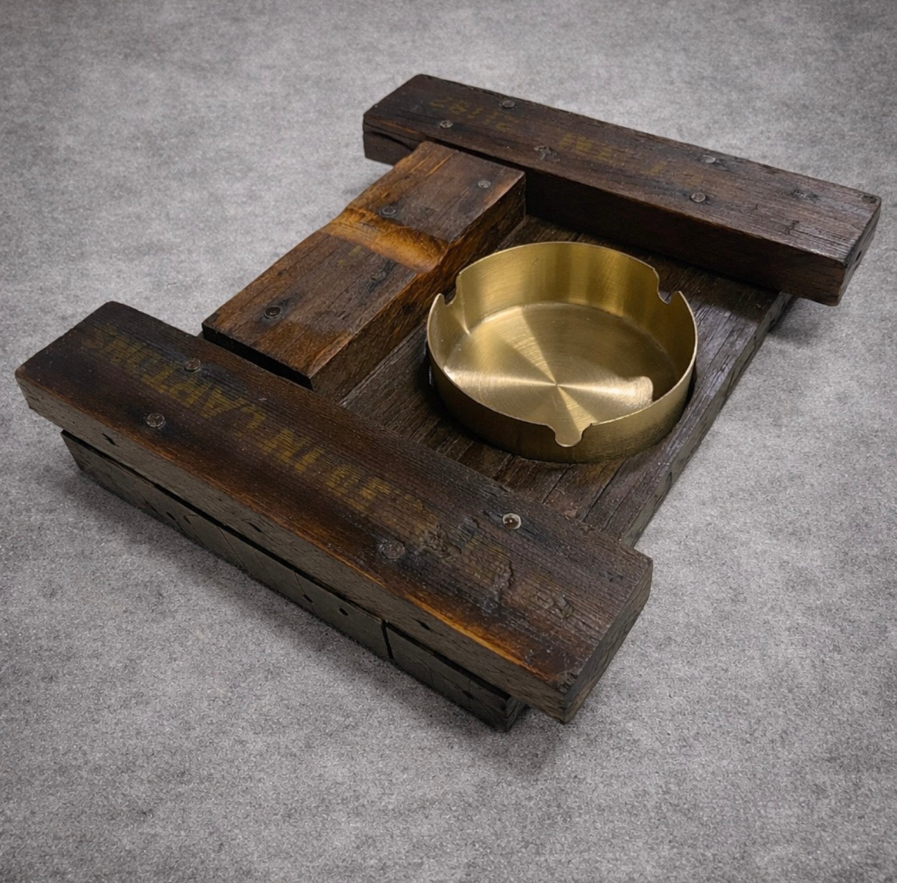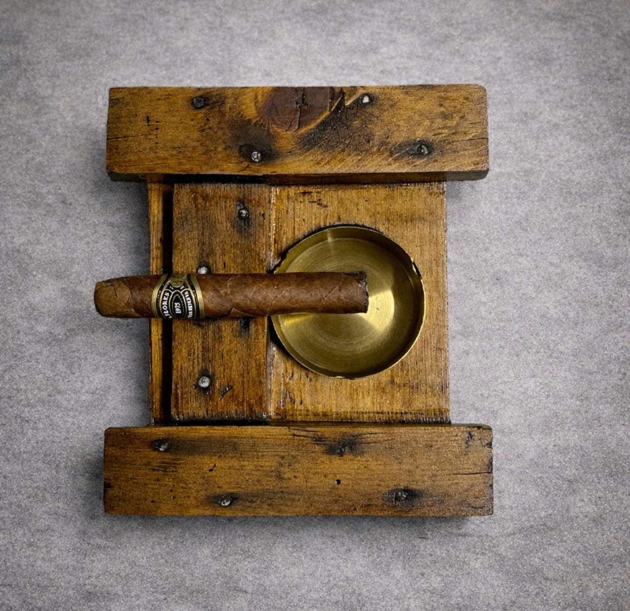 This cigar ashtray has been repurposed from a genuine WWII crate. The crate was originally used to house .50 caliber bullets. An indentation has been added for 1 cigar along with a removable ashtray. Let us know if you want a brass or stainless steel ashtray.